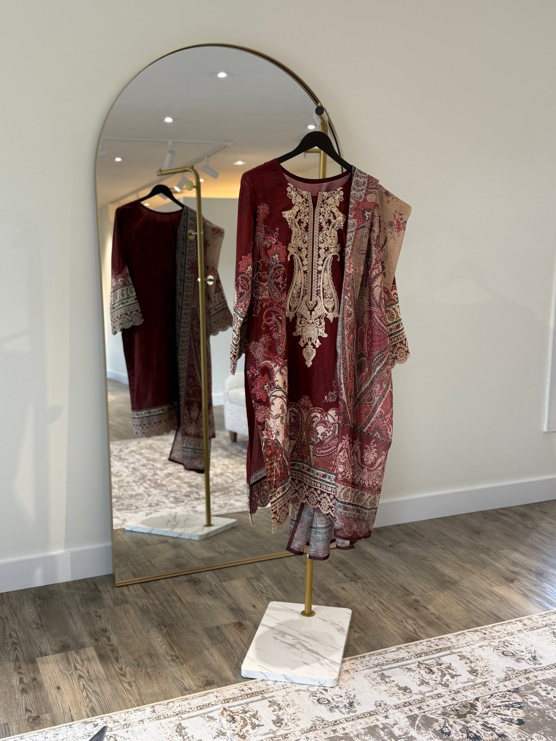 NEW Maroon three piece cotton Salwar Kameez with printed dupatta and embellished salwar.