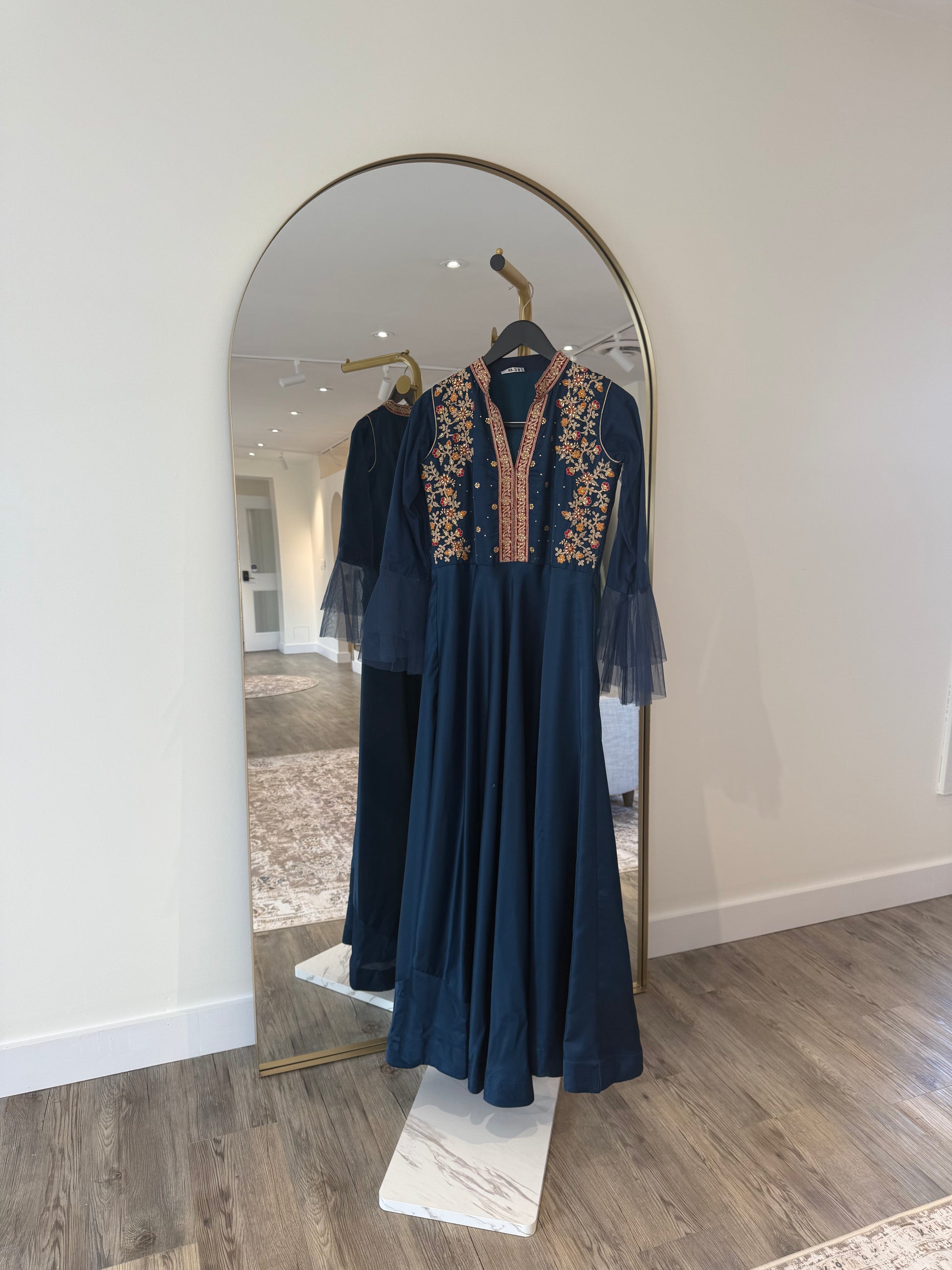 PRE LOVED Royal Blue Silk Anarkali adorned with multi coloured thread work on bodice. Comes with embroidered dupatta, and net churidar.